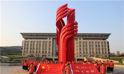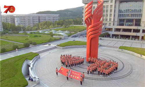 “我和我的祖国,一刻也不能分割……”嘹亮的声音在升华广场飘荡,几位老师及学生党员用深情款款的歌声,将自己对祖国的满腔热爱,对祖国最美好的祝福倾情演绎。用数字“70”和“心”形,代表中华人民共和国成立七十周年以及对祖国的热爱之情。动人的歌声和优美的旋律,充分体现出大家心中对党的热爱,对美好未来的憧憬,深切表达了大家对中华人民共和国成立七十周年的衷心祝福。济南大学上空,歌曲的余音也久久不散,合唱人员挥舞着鲜艳的国旗,跑道红的院服与鲜红的国旗互相映衬,把济大人积极向上的风采展现的淋漓尽致。