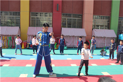 进入济南大学附属幼儿园后,园长向老师和同学们介绍了幼儿园孩子们的情况和注意事项,志愿者们纷纷表示将会以最大限度的调动孩子们的积极性并树立他们的自信心。他们与孩子们聊天、玩耍,并为孩子们献上了精彩的武术表演,高难度的武术动作赢得了孩子们的喝彩和掌声。他们手把手的教给孩子们简单的武术动作,在教授孩子们武术动作的同时也让孩子们了解到中国传统武术,引导孩子们初步接触和了解了中华武术传统文化,一方面可以使孩子们从小培养出以爱国主义为核心的尚武精神和武德情操;另一方面也可以加强学生们的安全防护教育,增强孩子们强身健体的意识,提高了锻炼身体的积极性,强身健体的同时还能培养孩子们的坚强意志品质,塑造完美的人格。